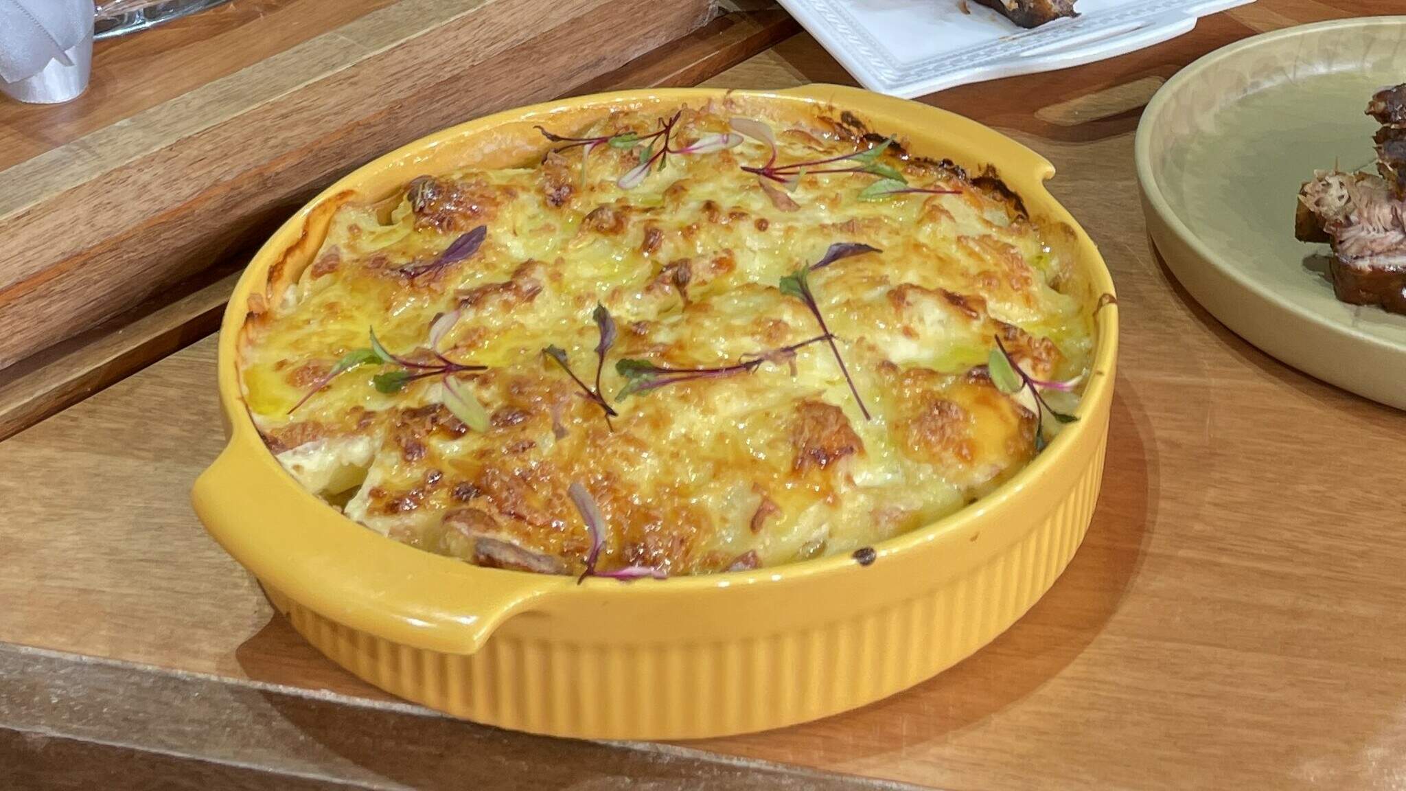 4. Retirar as batatas, colocar uma camada no refratário e cobrir com o queijo meia cura ralado.