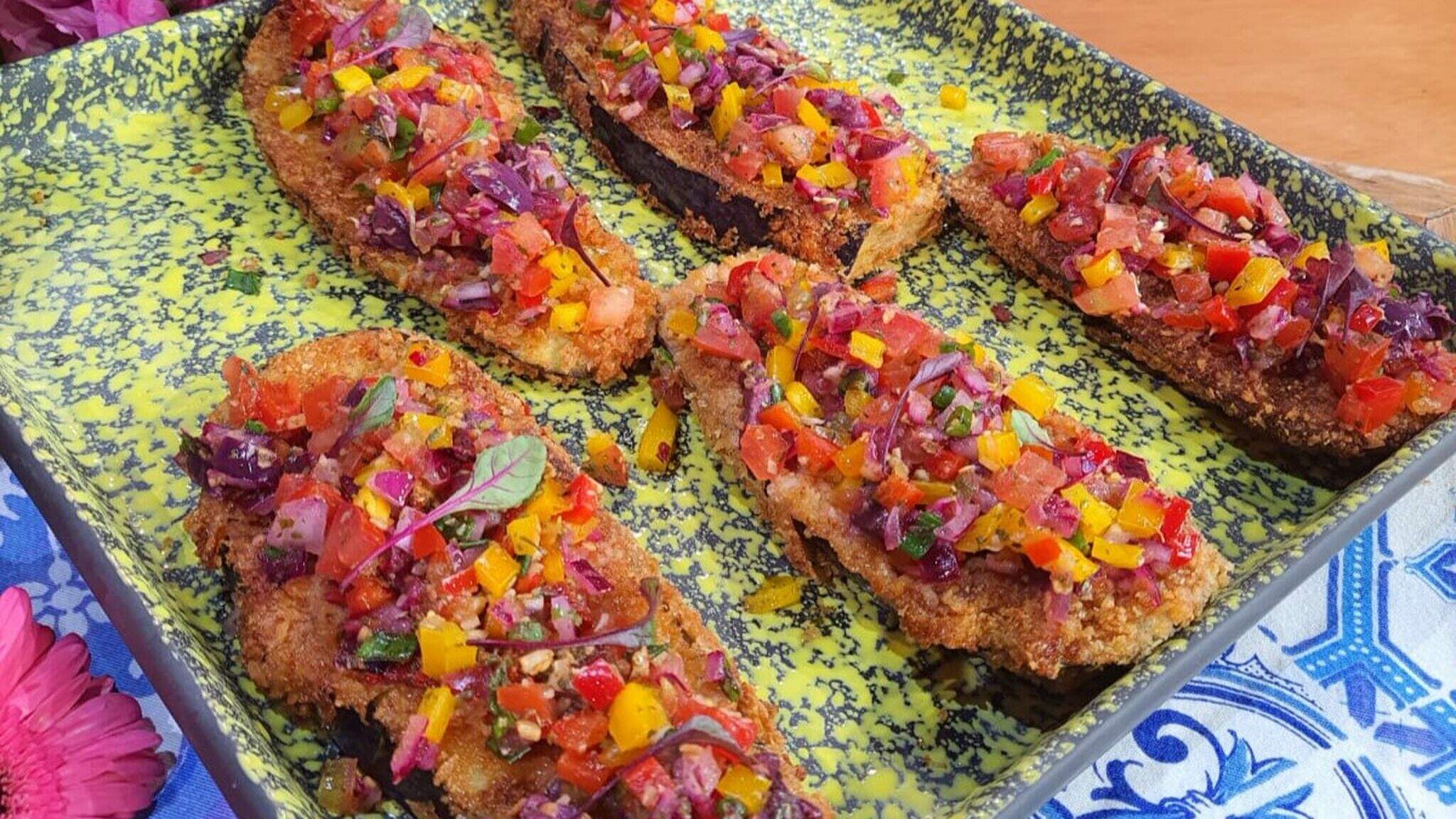 1. Corte a berinjela com a espessura de um dedo, tempere com sal e pimenta.