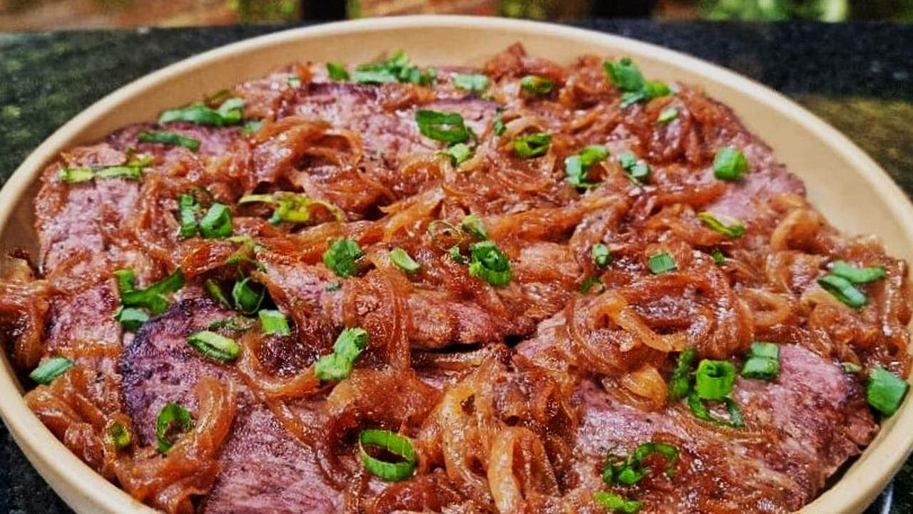 4. Na mesma panela, coloque mais uma parte de manteiga e logo na sequência a cebola fatiada. Deixe caramelizar e volte o bife para a panela.