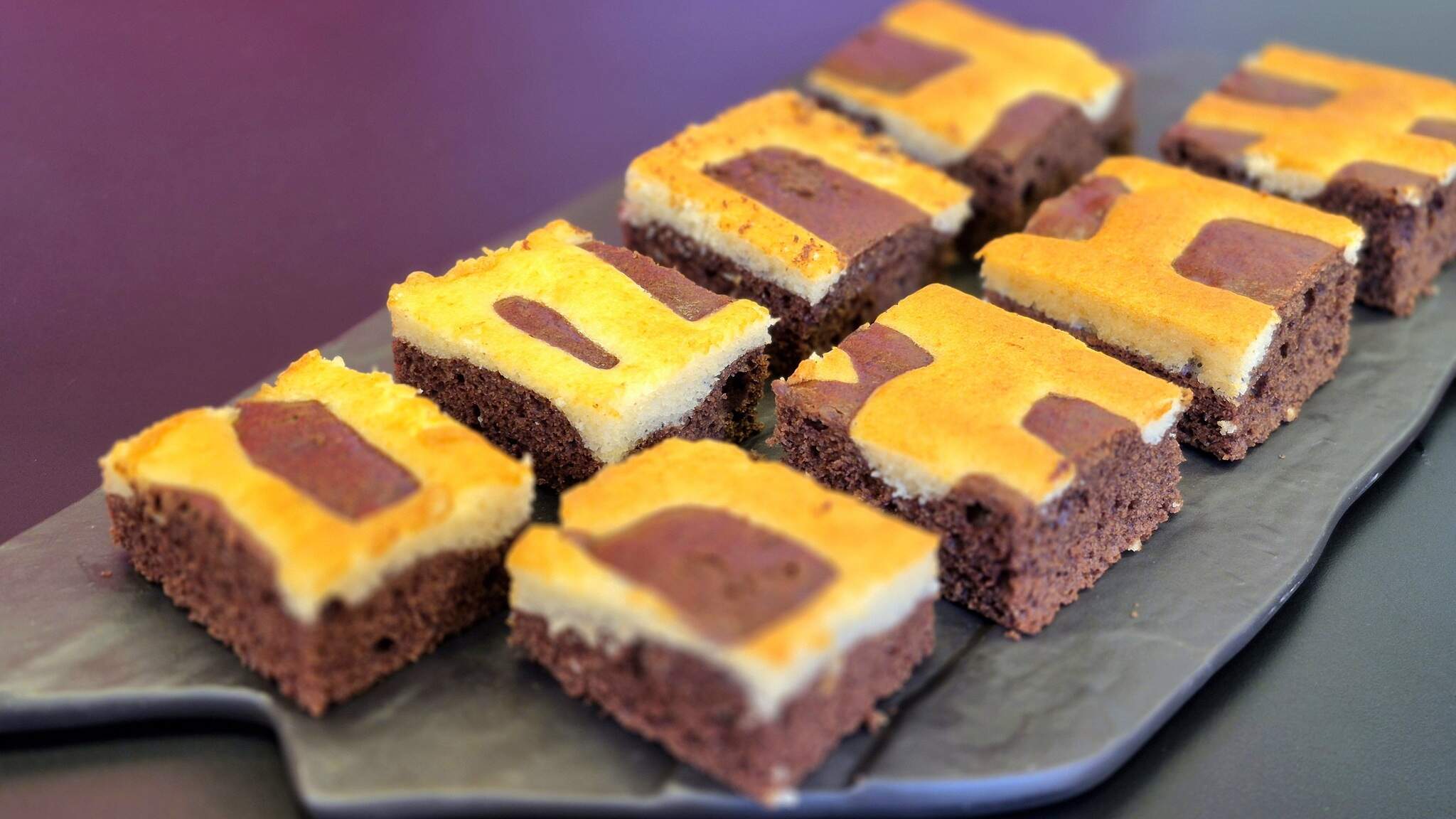 6. Jogue a massa de chocolate na assadeira e com o saco de confeitar coloque a massa branca intercalando.