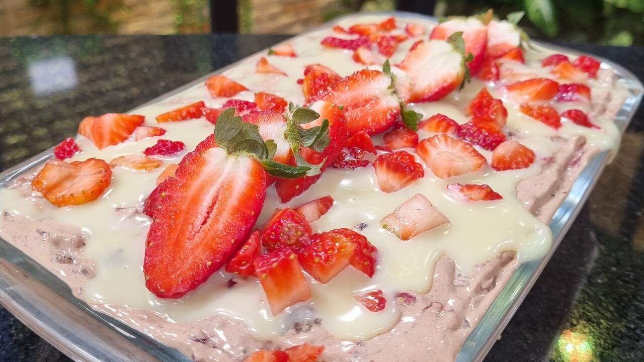 3- Coloque uma camada fina de geleia, morangos picados, a Mousse de chocolate. Coloque mais uma camada de massa e repita esse processo
