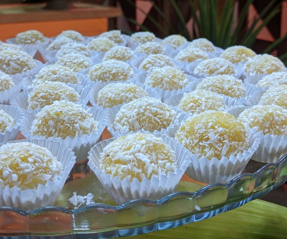 Bata no liquidificador o leite condensado, o milho verde escorrido e o coco ralado. Leve a mistura ao fogo com margarina. Mexa até desprender da panela ou até obter ponto de brigadeiro convencional. Depois, deixe esfriar. Modele os brigadeiros e passe no coco ralado.