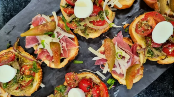 1. Corte o pão em fatias redondas, coloque azeite, tomilho seco e levo para assar em forno alto por aproximadamente 10 minutos;
