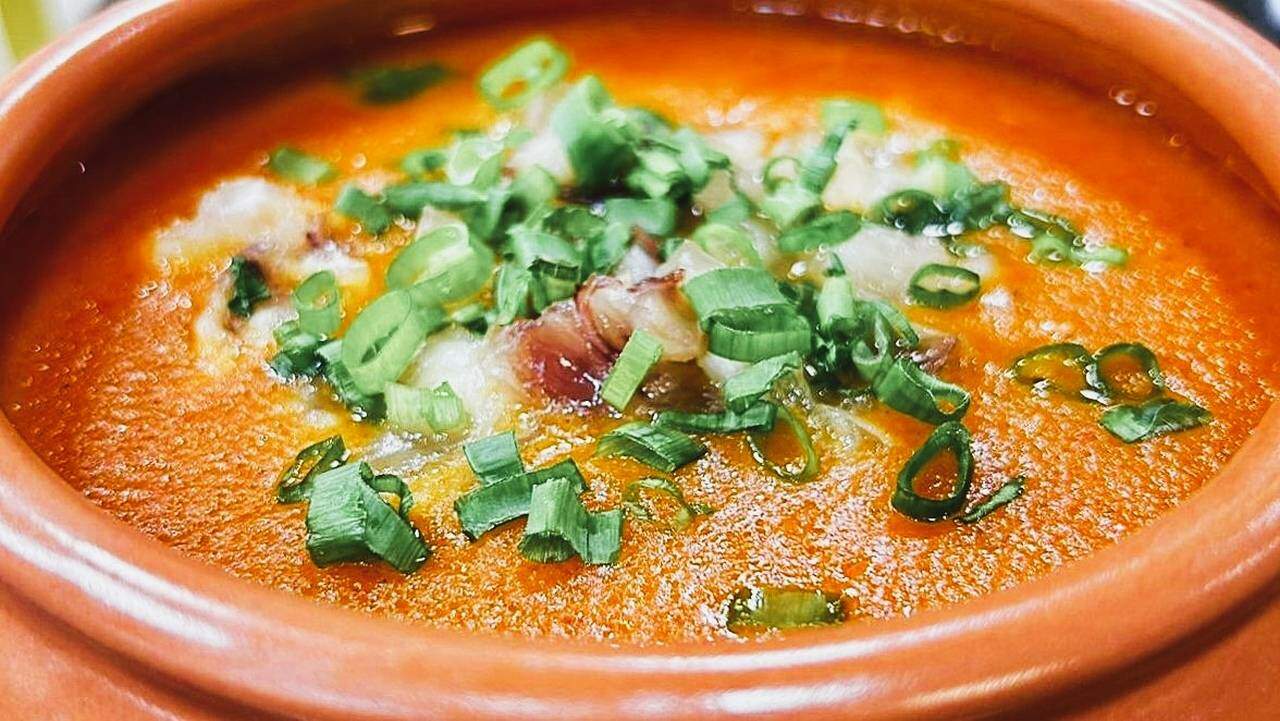 5. No liquidificador, coloque o vinagre, os pimentões, a cebola, a parte branca da cebolinha, o alho-poró, o cominho, o colorau, o tomate pelado e a farinha de trigo, tempere com sal e pimenta;