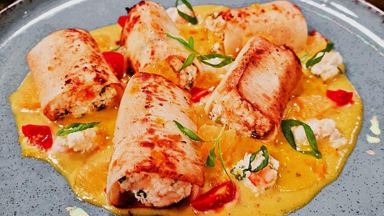 8. Retire os canelones da frigideira e coloque o suco de laranja, o creme de leite e deixe reduzir até ficar cremoso;