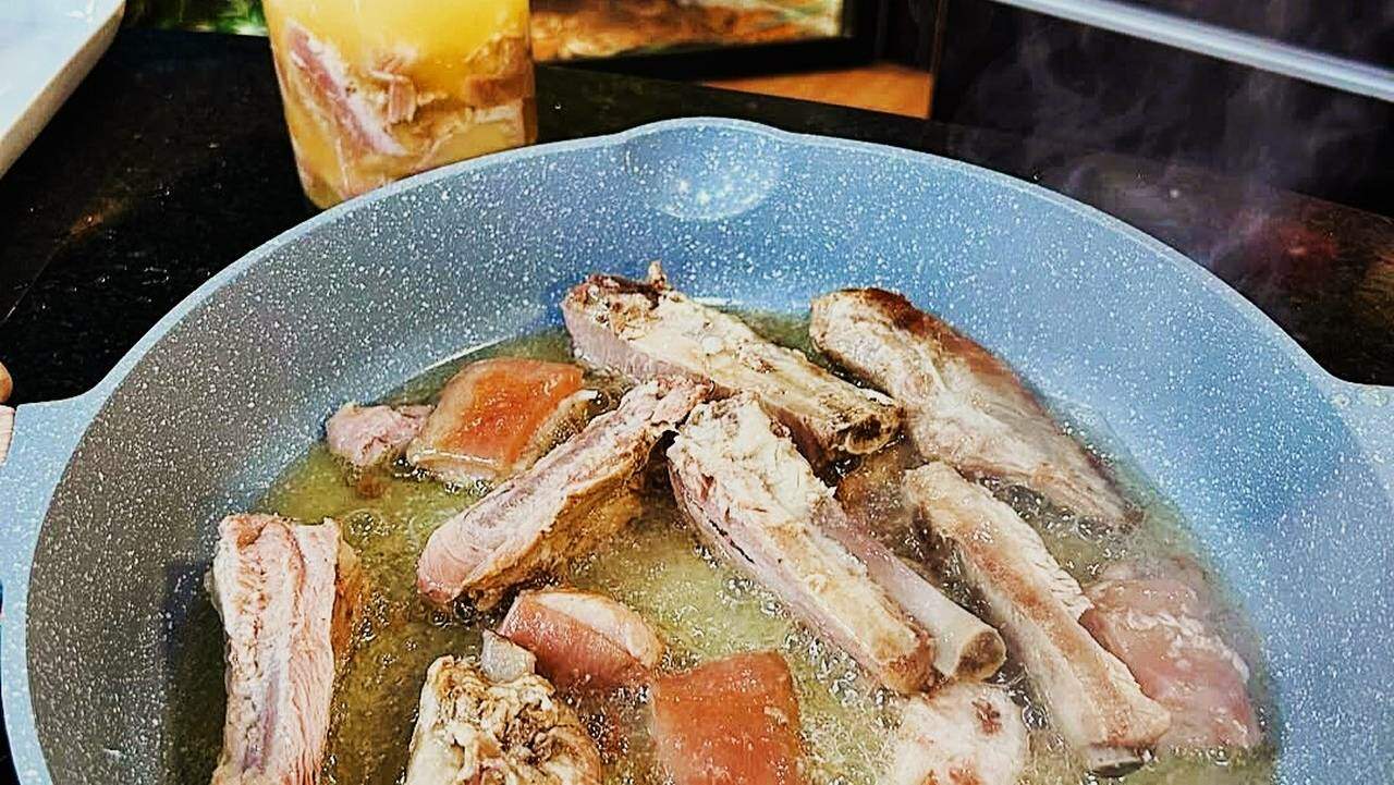 1. Retire o couro e a gordura da barriga, corte em cubos grandes e leve em uma panela em fogo bem baixo e deixe cozinhar até derreter bastante a gordura.