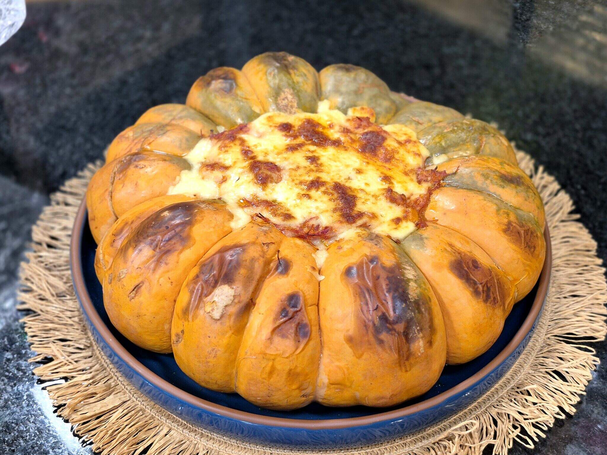 6. Coloque a preparação dentro da moranga, cubra com o restante do requeijão cremoso e com a muçarela.