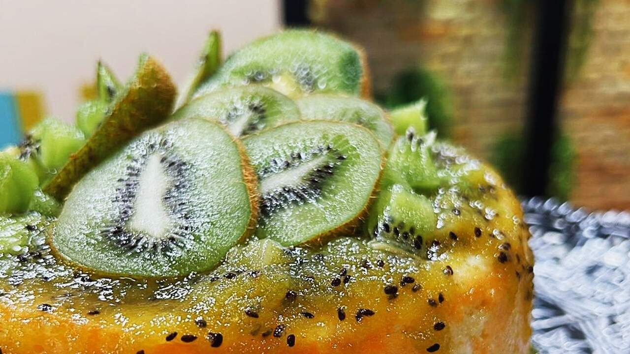 4- Cubra com a geleia de kiwi e finalize com kiwis fatiados por cima.