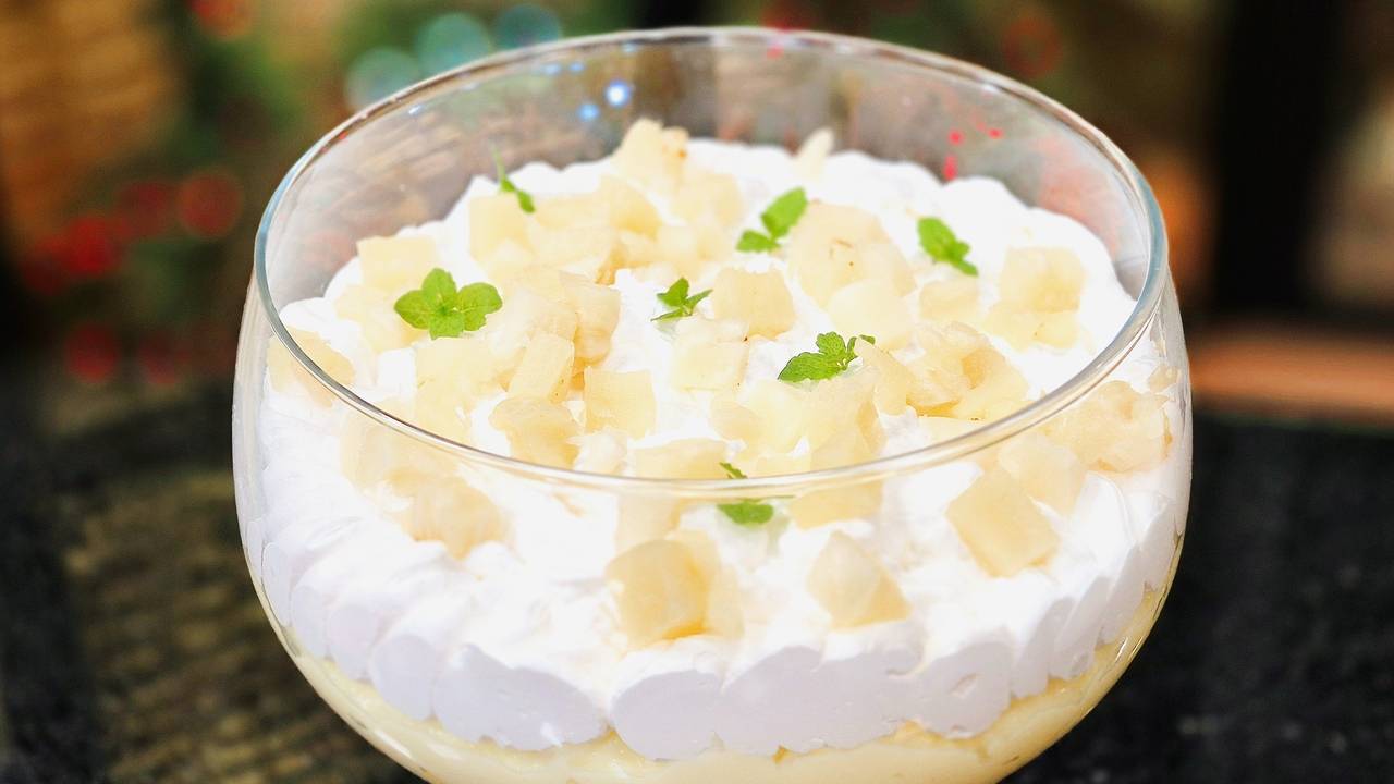 1. Em uma taça, coloque a calda com o abacaxi, o creme e cubra com o chantilly.
