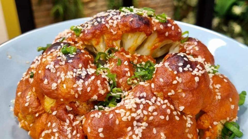 6. Em uma assadeira, coloque a couve-flor, cubra com o molho e leve para assar a 200°C por 30 minutos;