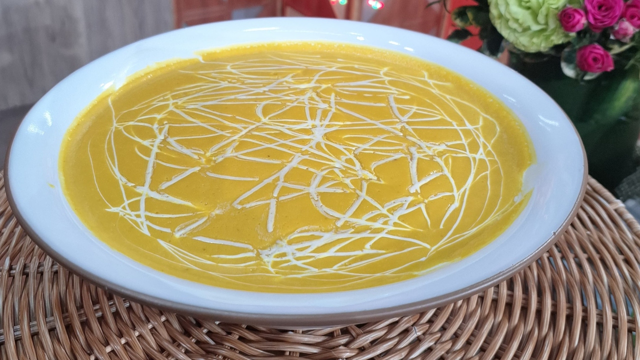 Em uma panela, coloque o caldo, a polpa da abóbora, o queijo cremoso e deixe ferver.