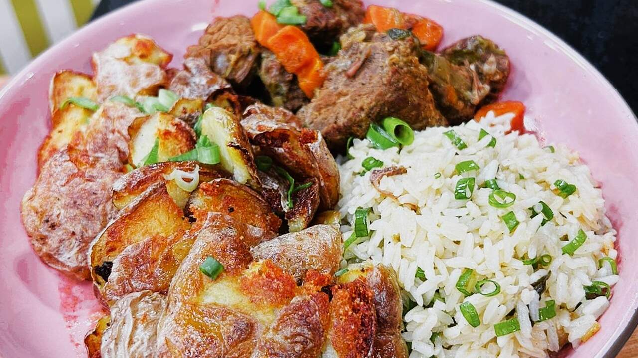 2. Em uma panela de pressão, coloque azeite, sele bem a carne, coloque o restante dos ingredientes, deixe dourar e depois cubra com o caldo;