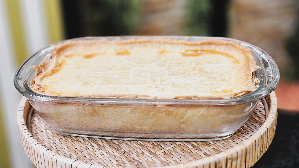 2. Cubra todo o fundo e as bordas da travessa. Deixe um pouco da massa para a tampa. Reserve.