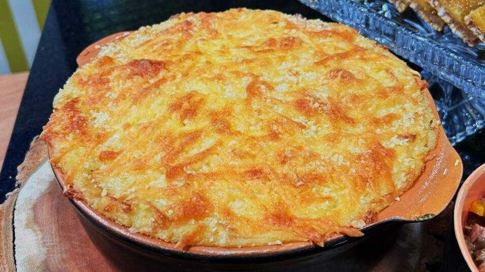 1. Em uma travessa, coloque o peixe, cubra com o purê, coloque a muçarela e salpique farinha panko;