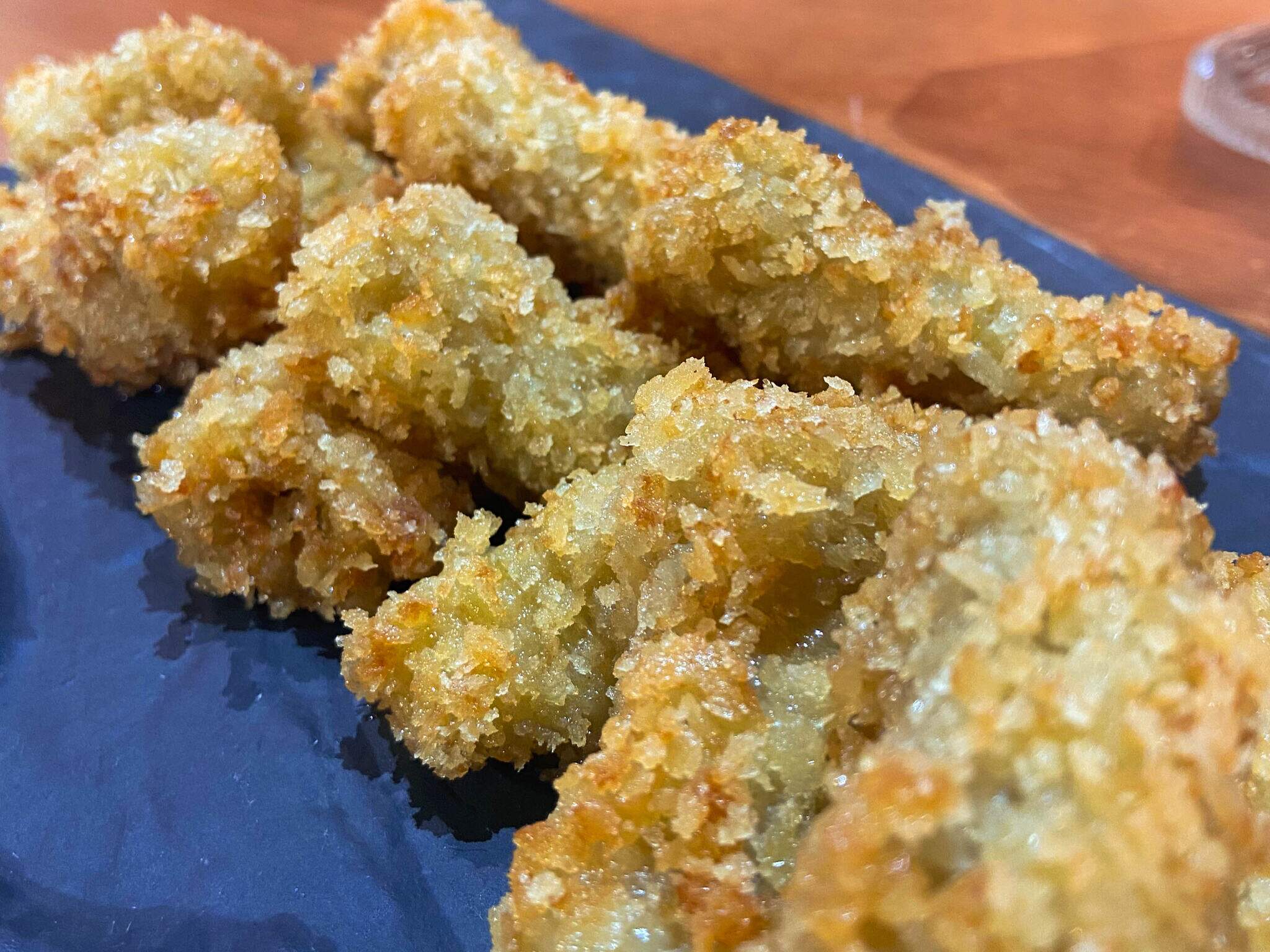Corte as bananas em 3 pedaços, passe no ovo, no trigo e na farinha panko. Em seguida, leve para fritar.