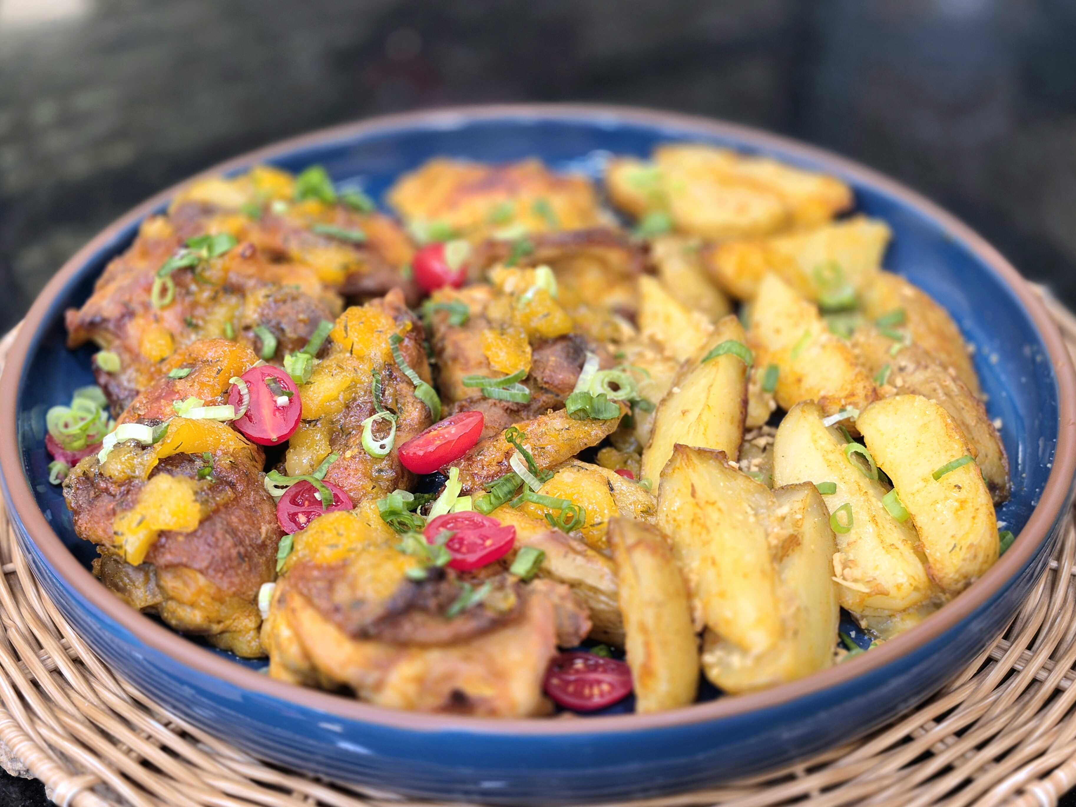 4. Coloque em uma assadeira com as batatas, cubra com papel alumínio e leve para assar por 1 hora a 160°C