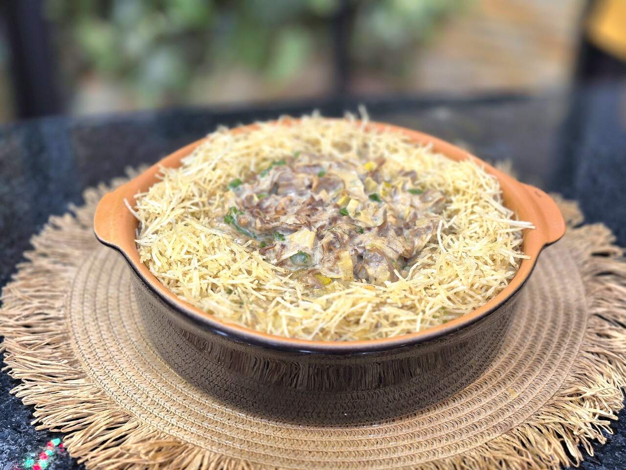 8. Desligue o fogo, coloque o requeijão cremoso, ajuste o sal e a pimenta e finalize com cebolinha verde e batata palha.