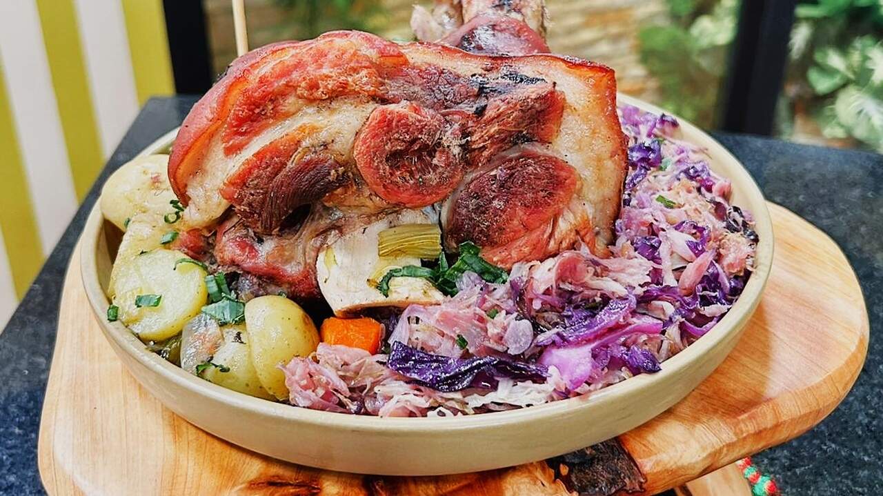 4. Retire da panela, coloque em uma assadeira junto com as batatas bolinhas cortadas ao meio, coloque um pouco do caldo do cozimento e leve para assar a 200°C por aproximadamente 1 hora. Deixe ficar bem dourado;