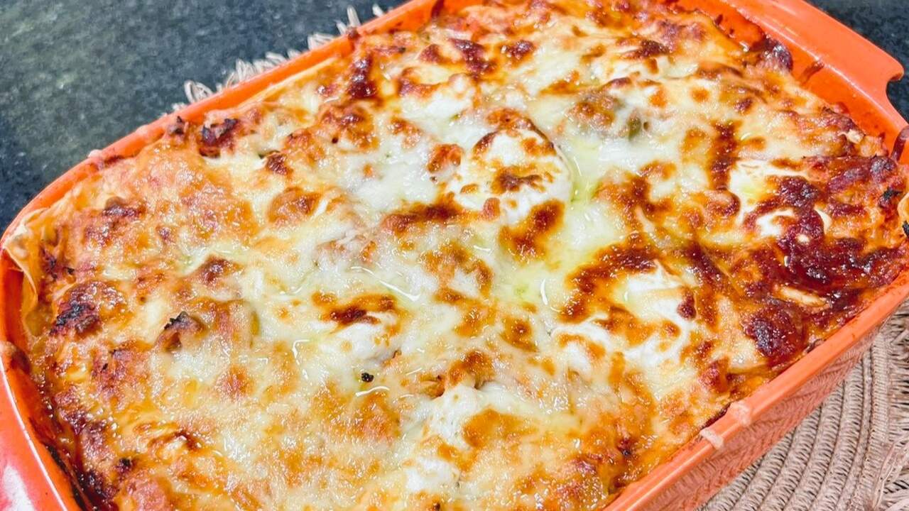 3. Em uma travessa, coloque um pouco do refogado do frango, coloque a massa de lasanha, cubra com o frango, coloque uma parte do queijo meia-cura, o presunto, uma parte do requeijão cremoso e repita até preencher toda a travessa.