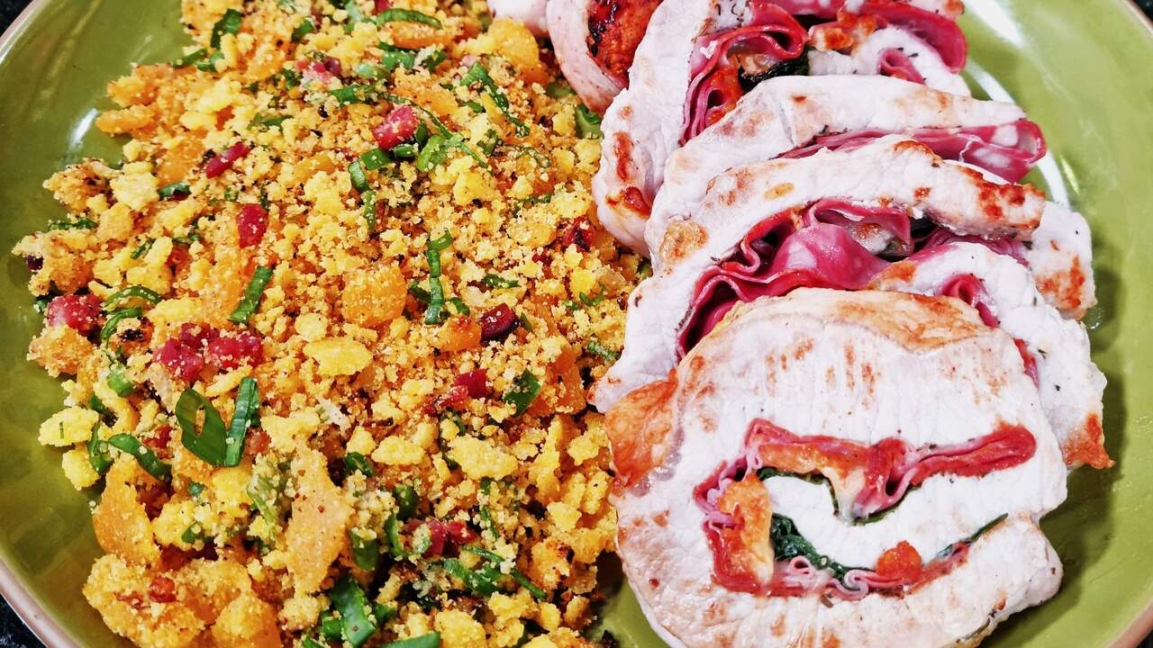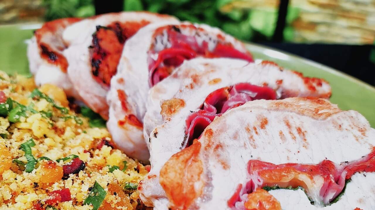 Receita de Lombo recheado com Calabresa acompanhado de Farofa de Damasco do programa "Sabor de Vida".