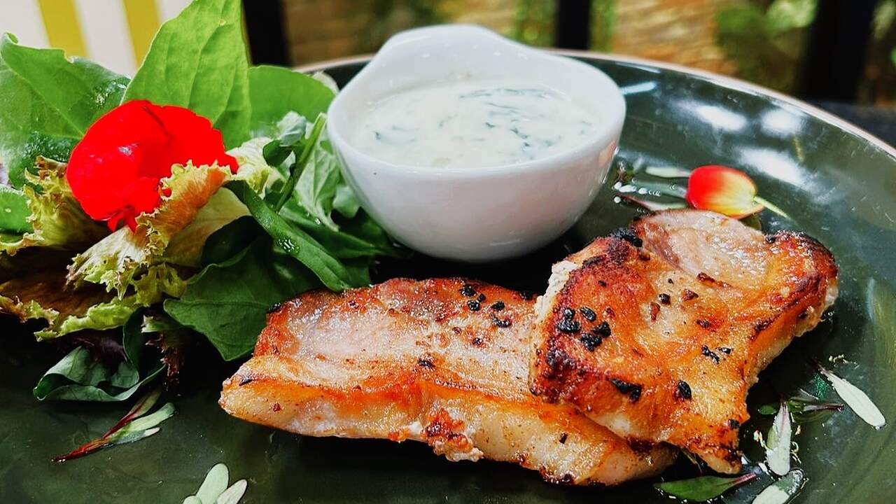 6. Em outra frigideira , regue o fundo com o azeite de oliva e leve ao fogo alto, quando estiver bem quente, coloque o lombo deixe grelhar uns 3 minutos de cada lado e sirva com o creme de espinafre.