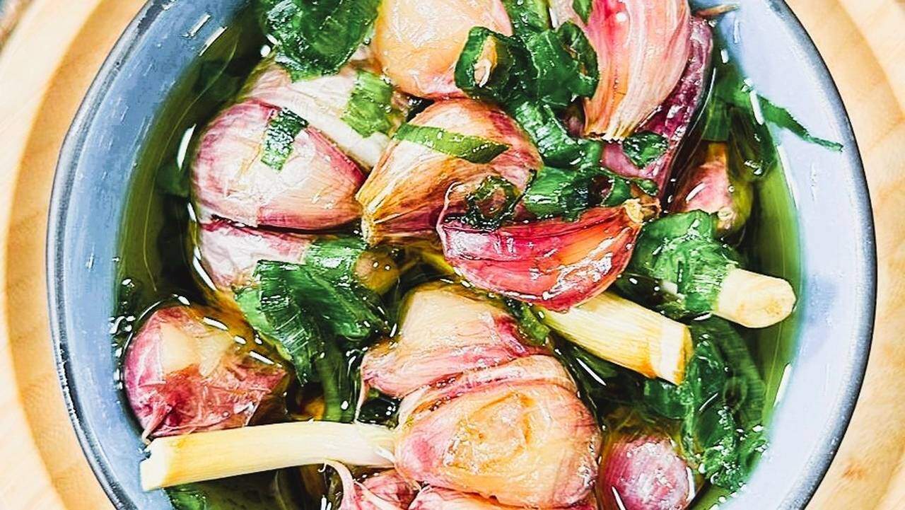 1. Coloque as cabeças de alho no papel alumínio, regue com azeite, sal e pimenta;