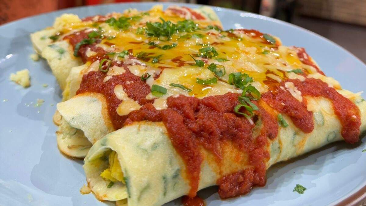 2 - Despeje um pouco de molho em um prato, coloque a panqueca recheada por cima e cubra com mais molho;