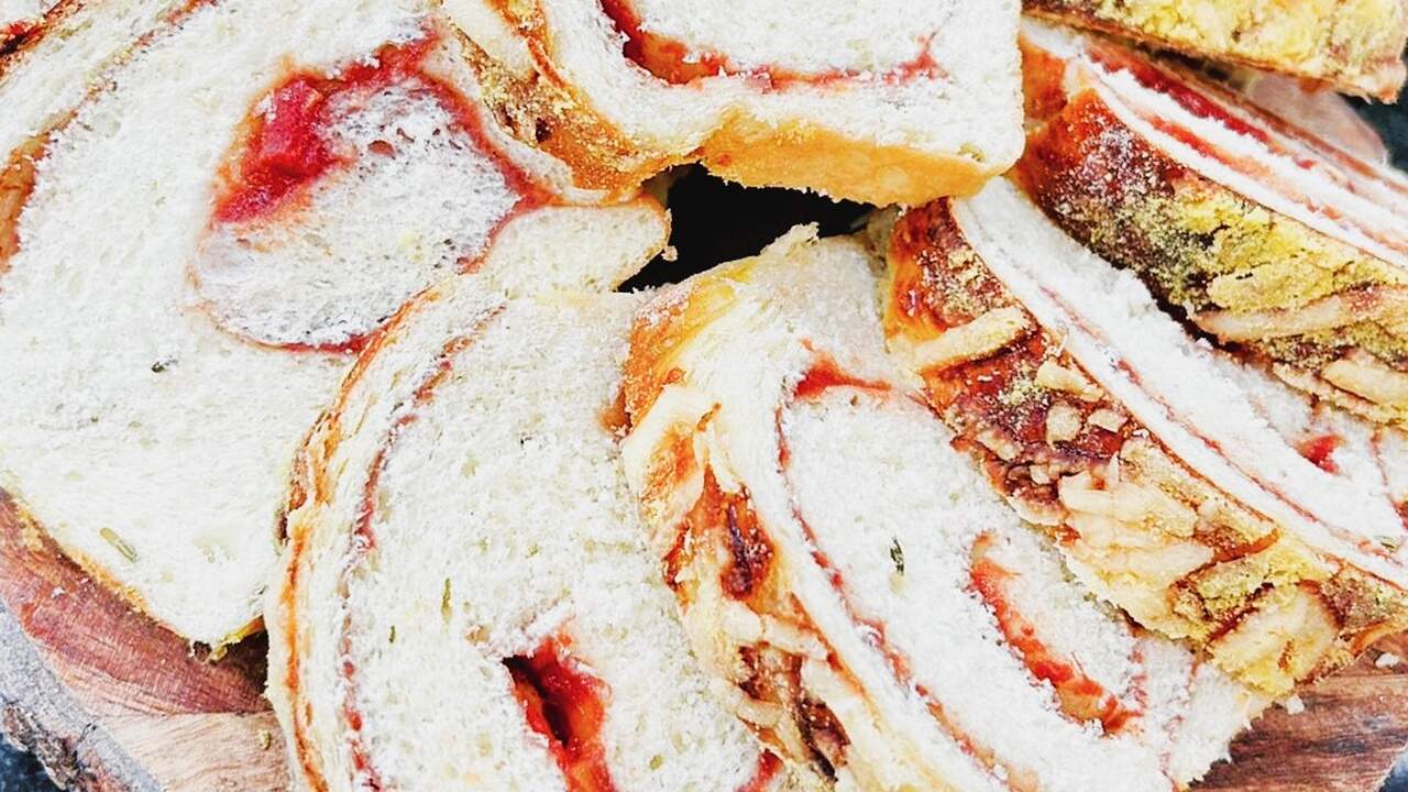 5. Abra a massa com rolo espalhe a goiabada cremosa enrole igual um rocambole e leve para descansar por mais 40 minutos ou até que dobra de tamanho;