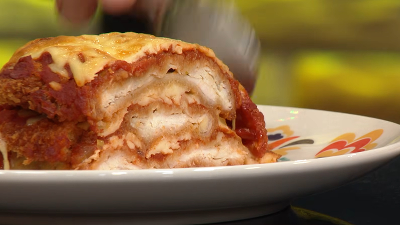 4. Em uma travessa, coloque uma concha de molho, um filé frito, mais molho, mussarela, outro filé, mais molho e mussarela. Repita mais uma vez.