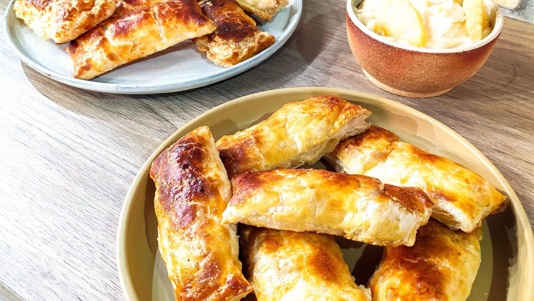 Corte a massa folhada em quadrados, passe o creme na metade, e adicione dois pedaços de abacaxi em calda (o que cortou em 4).