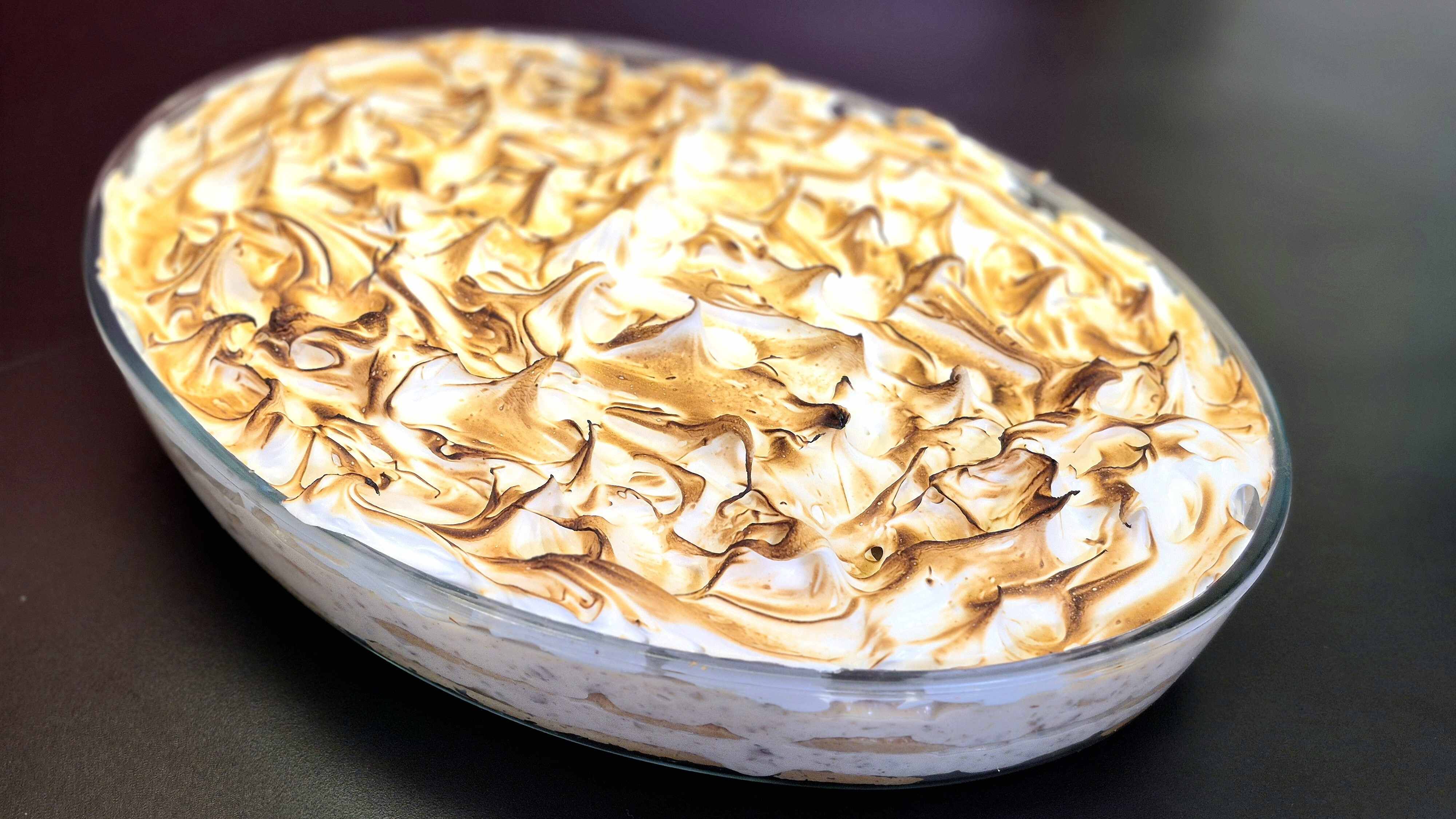 3. Decore o pavê com o merengue, passe no maçarico se quiser e leve para gelar novamente.