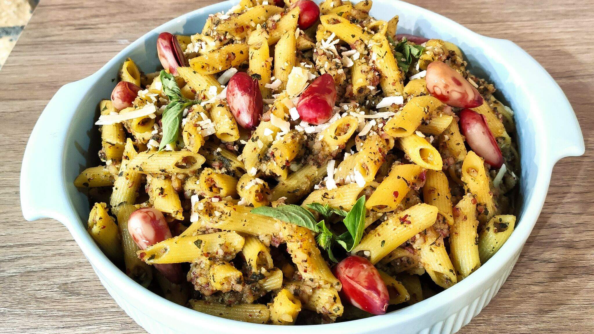 Em um processador de alimentos, junte o azeite, o pinhão cozido, o parmesão, o manjericão fresco, o sal e pimenta a gosto.