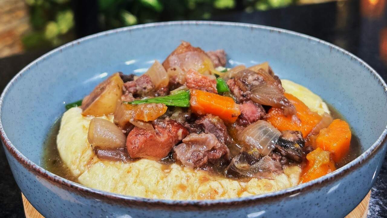 4. Use para finalizar a carne. Polenta cremosa e batata, cebola e cogumelo glaciados.