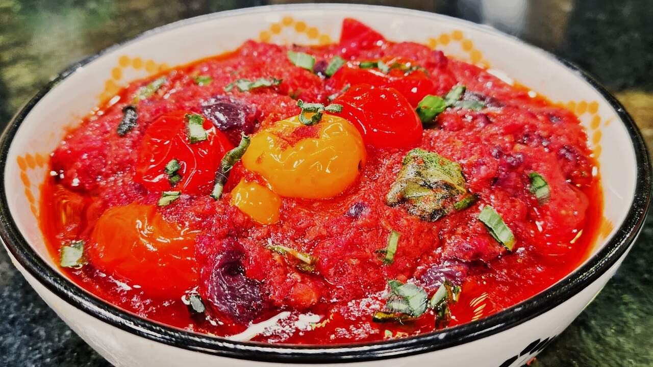 2. Coloque as azeitonas, o tomate pelado, o tomate cereja e deixe refogar bem até o tomate desmanchar;