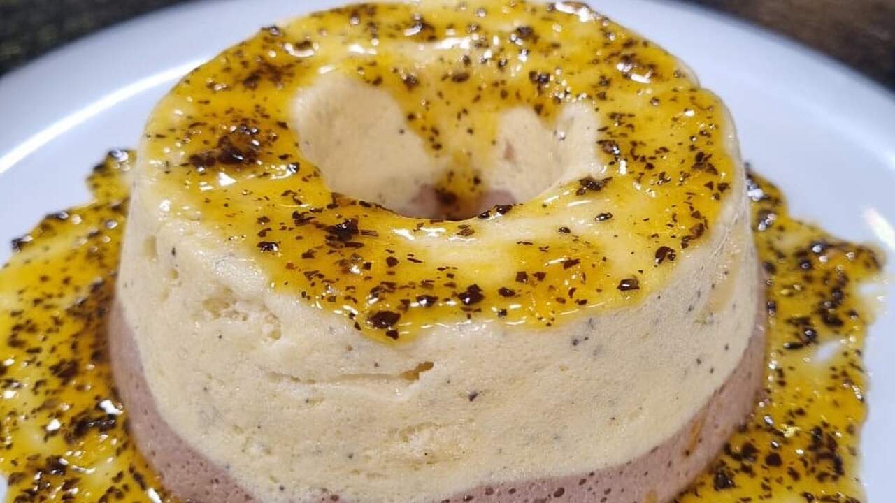 5. Unte uma assadeira com furo no meio, coloque o pudim de maracujá, leve na geladeira por 15 minutos e depois coloque o pudim de chocolate por cima.