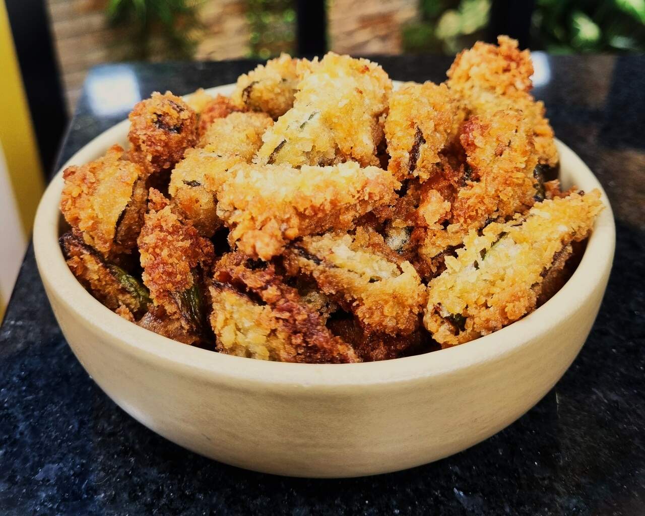 4. Passe o quiabo no ovo, na farinha de trigo e na farinha panko.