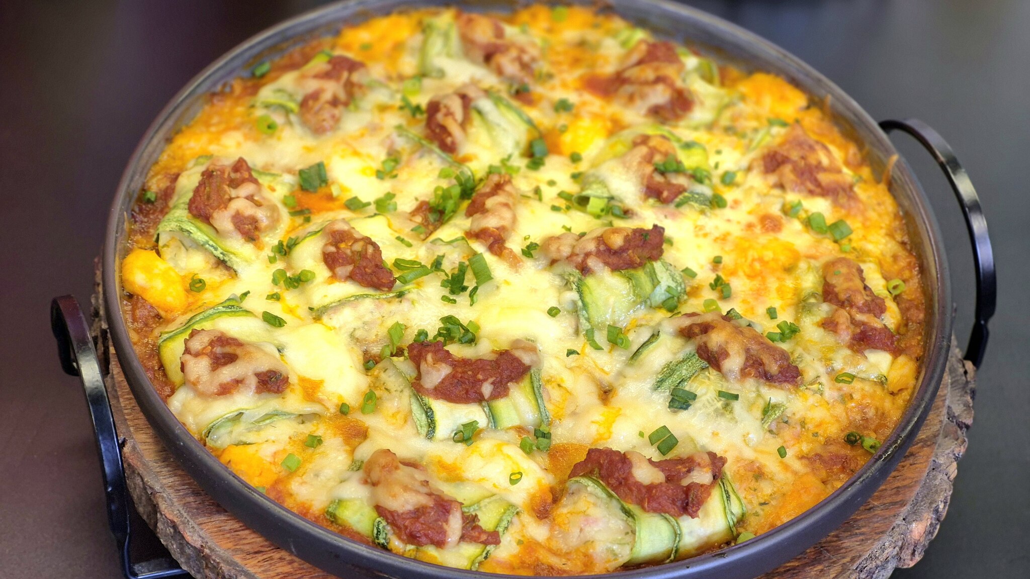 5. Coloque um pouco do molho no fundo de uma travessa, coloque os rolinhos de abobrinha por cima e cubra com o restante do molho.