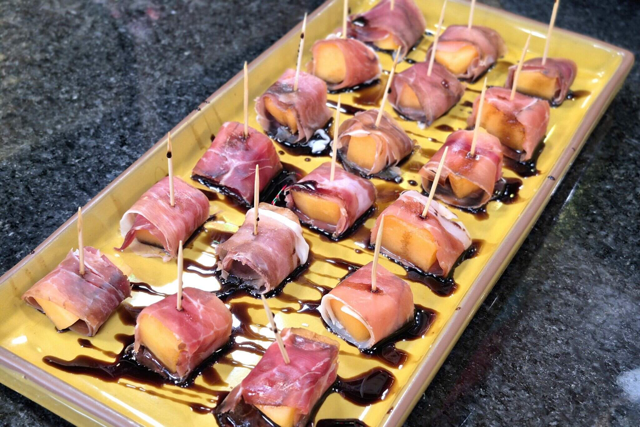 3. Enrole o melão no presunto, coloque o molho por cima.