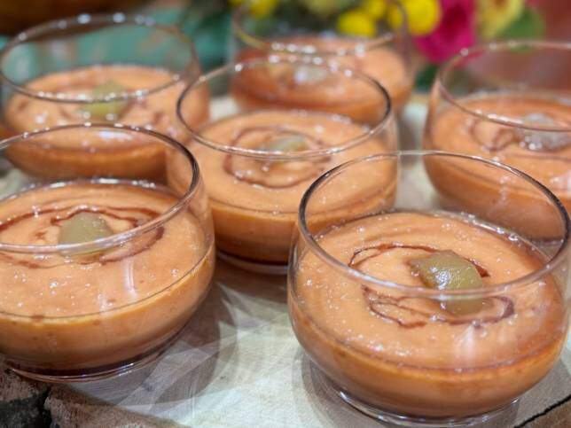 E por fim a sobremesa será Doce de Mamão e Creme de Papaya com Cassis. O doce de mamão é uma sobremesa típica do interior do Brasil, especialmente popular nas regiões Centro-Oeste e Sudeste. O cassis é uma fruta pequena, de cor escura e sabor doce e ácido. Essa fruta é originária da Europa do Norte e pode ser consumida em geleias, doces, xaropes e licores. Uma das razões do sucesso do Creme de Papaya é sua facilidade, com apenas mamão maduro batido com sorvete de creme ou baunilha, finalizado com um toque de licor de cassis, é possível ter uma sobremesa saborosa.