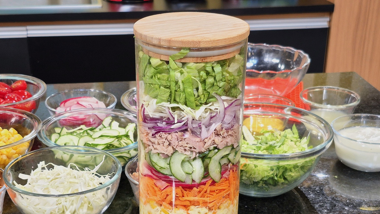 6- Acrescente a cenoura, o rabanete, o pepino, o atum, a cebola roxa, o repolho ralado e o alface.