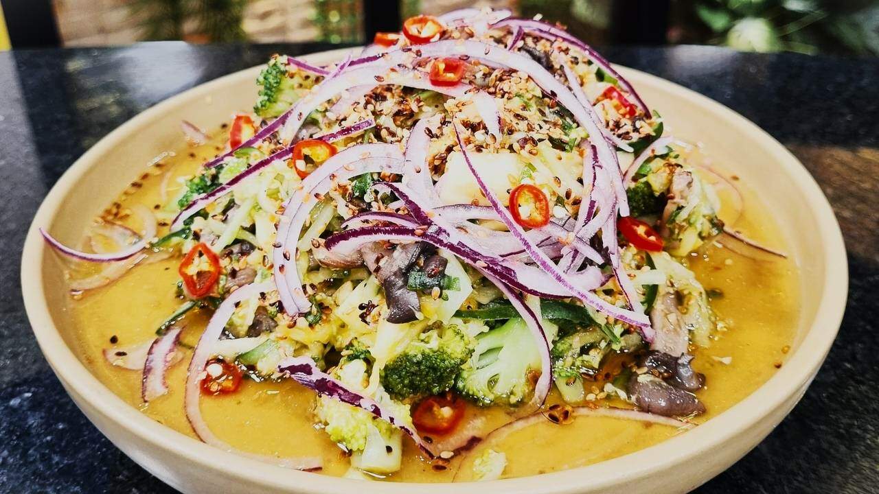9 - Em uma tigela grande, misture o mamão marinado com o pepino, a acelga, o brócolis cozido, o refogado de cogumelos, as pimentas, a cebola roxa fatiada e a cebolinha verde;