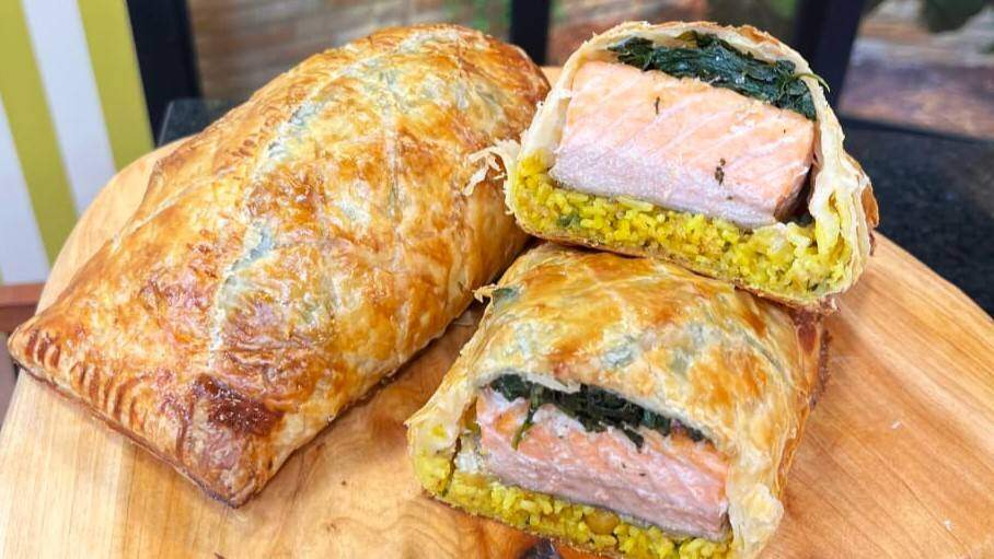 6. Abra a massa folhada, coloque o arroz no centro da massa folhada, o salmão logo em cima do arroz, o espinafre em cima do salmão e enrole a massa folhada.