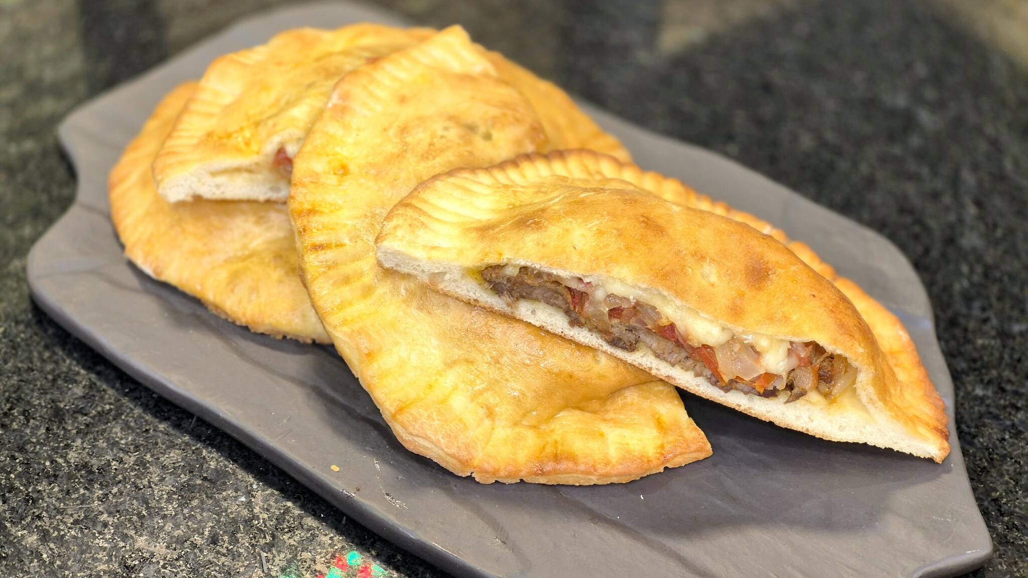 6. Abra a massa, acrescente os bifes, o refogado de tomate e o queijo. Cubra com a outra parte da massa, pincele ovo e com um garfo, faça furos na massa.