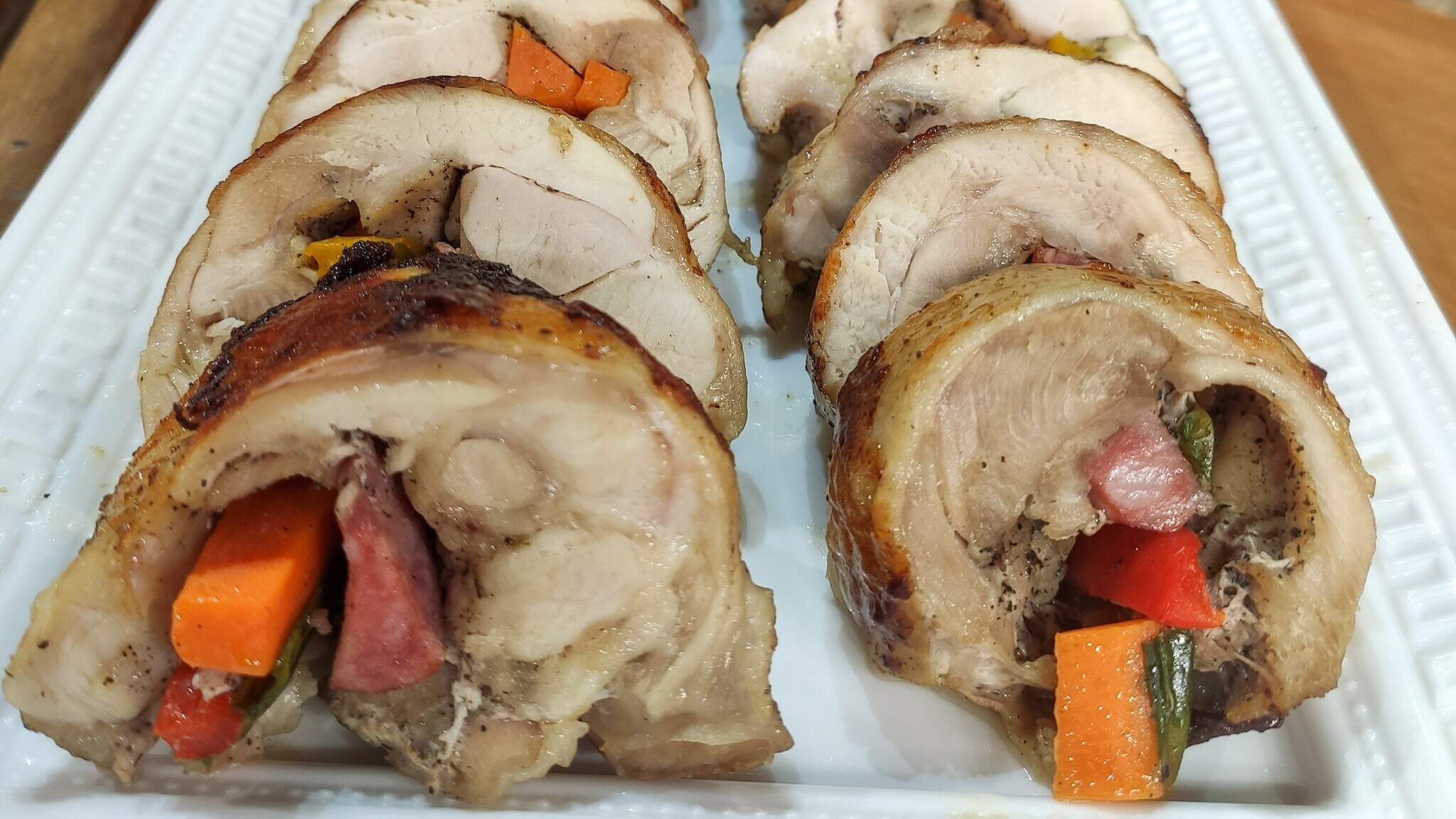 3. Colocar em cima de cada sobrecoxa aberta os legumes, a calabresa e a cebolinha. Temperar com sal e enrolar como se fosse um rocambole.