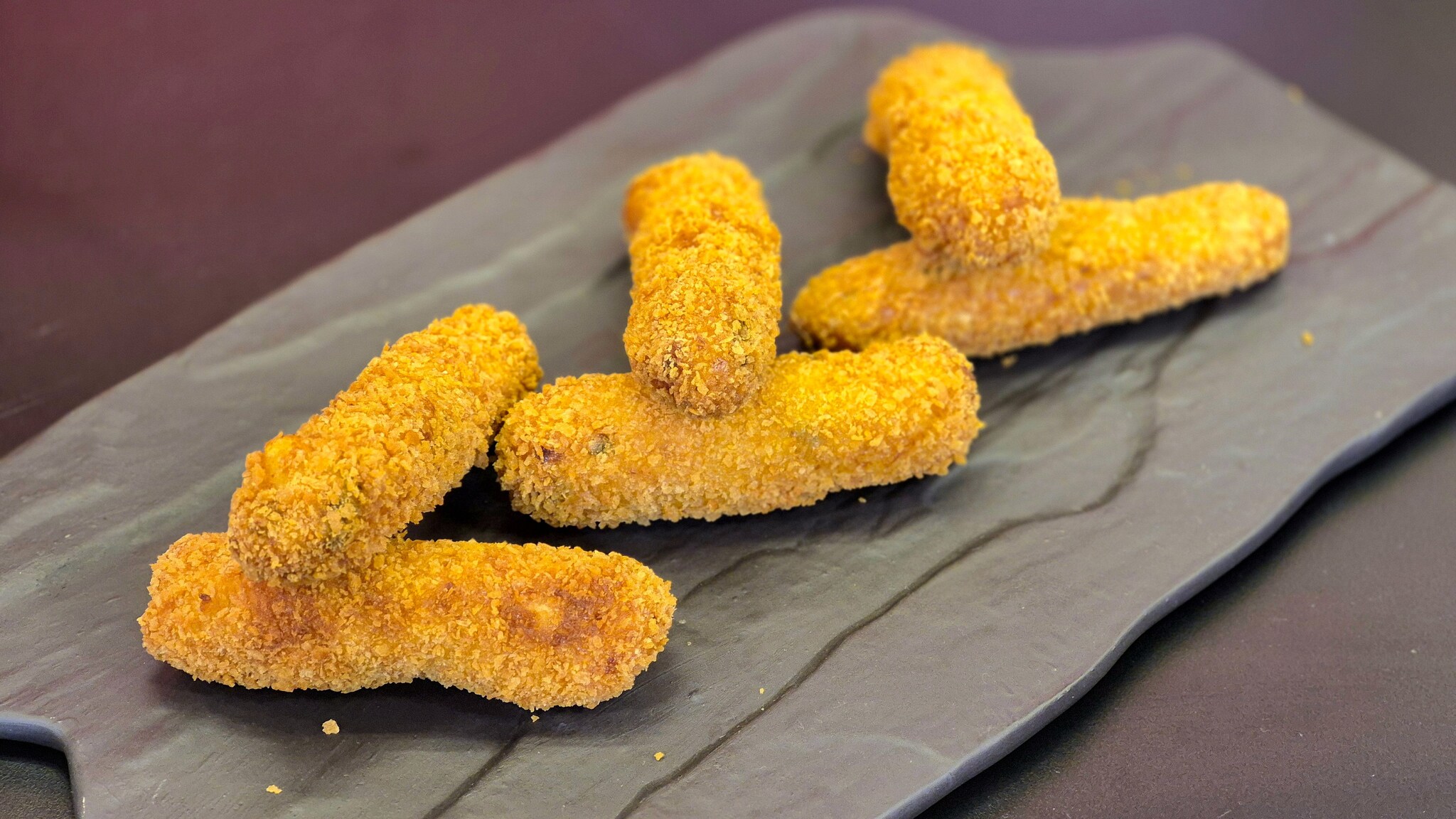 4. Faça porções de 60g, enrole, empane com o ovo e a farinha panko e leve para fritar.