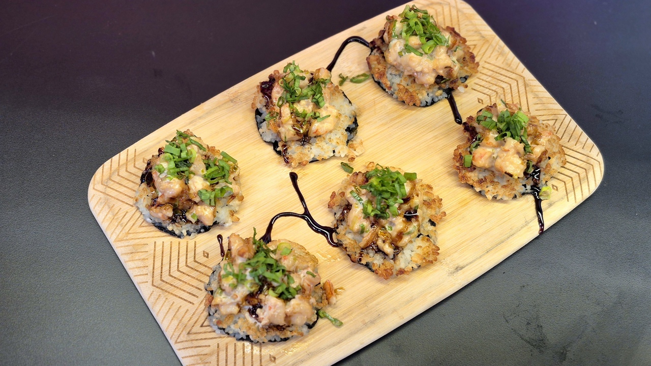 2. Espalhe o arroz por cima da alga e leve para dourar em uma frigideira com um pouco de azeite.