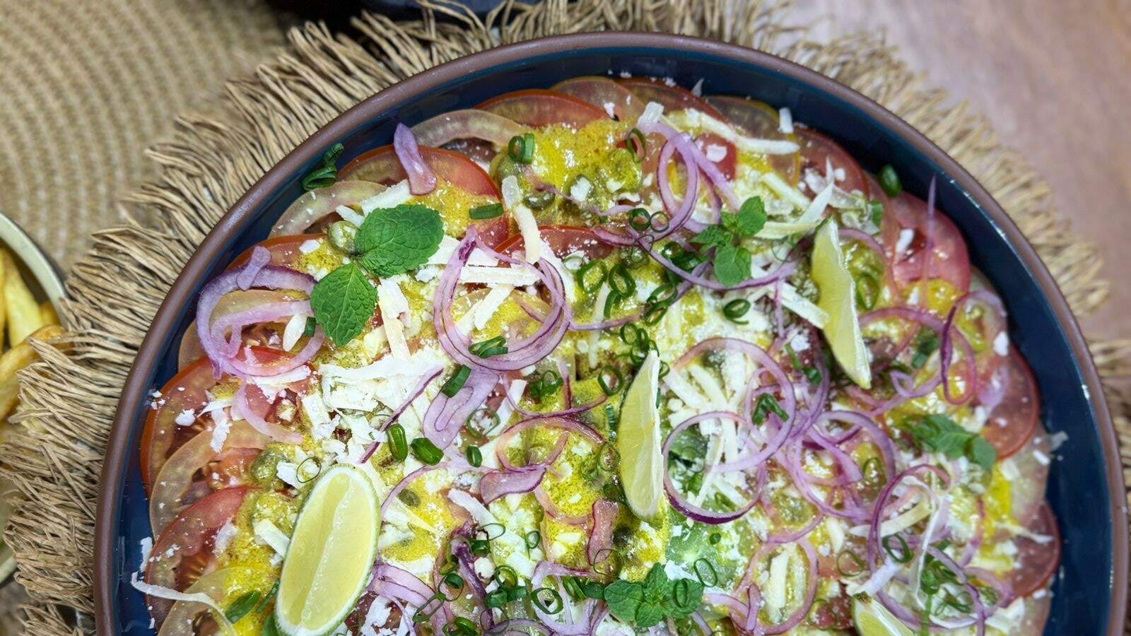 4 - Coloque em cima dos tomates e finalize com cebola fatiada, o parmesão e cebolinha fresca.