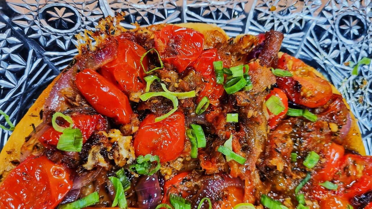 2. Coloque as rodelas de tomate, o tomate cereja, a cebola roxa, salpique com o tomilho seco, sal e pimenta. Deixe dourar;