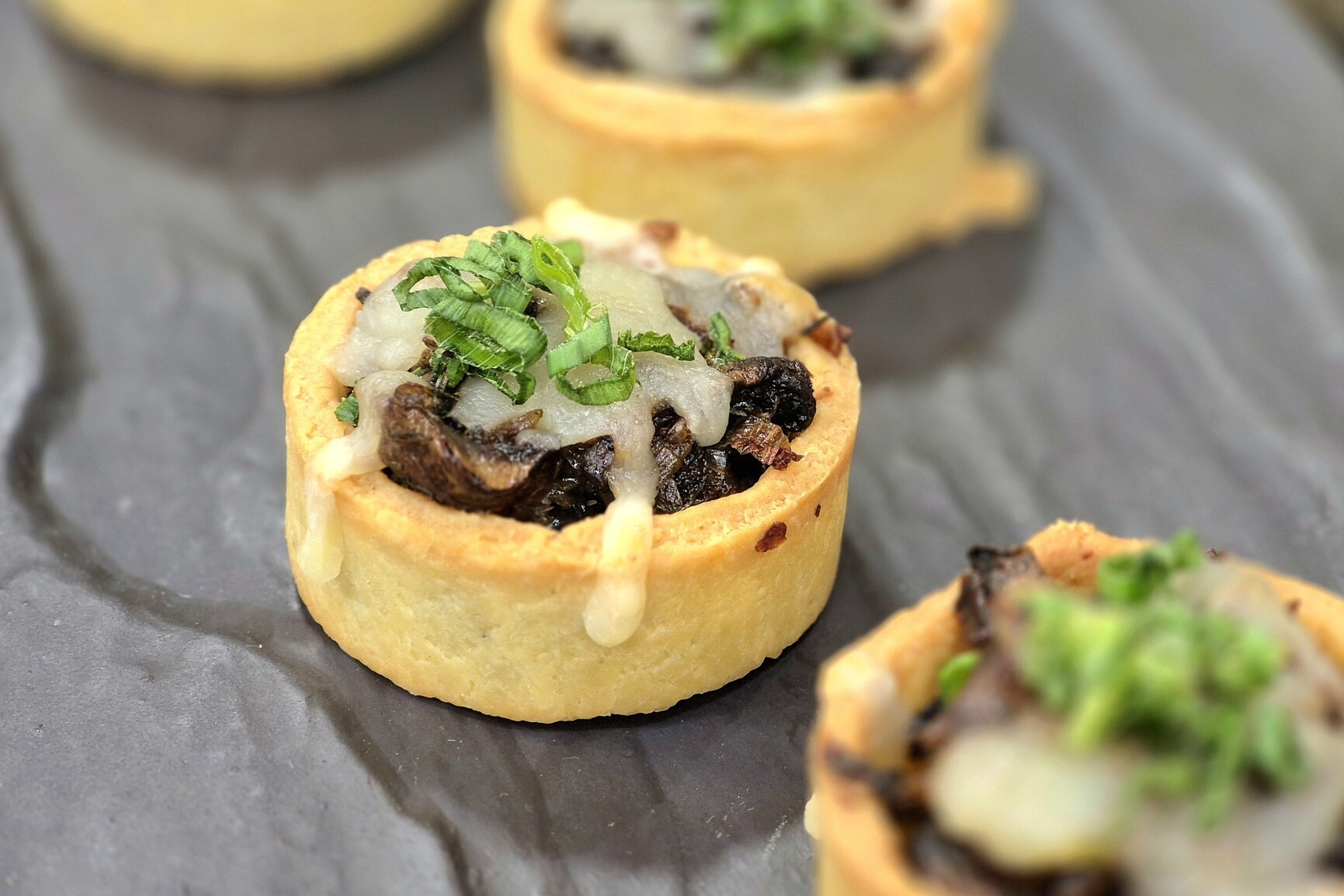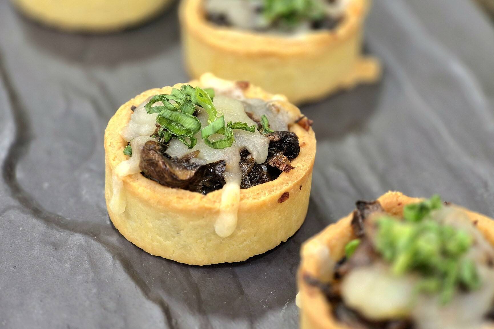 5. Coloque o recheio na tartelete, cubra com o queijo meia-cura e leve para gratinar a 200°C por 10 minutos.