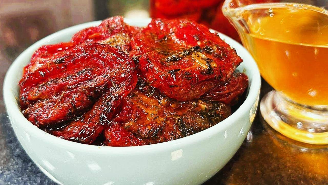 1. Corte os tomates ao meio, coloque em uma assadeira, salpique o açúcar, azeite, sal e pimenta e leve para assar a 150°C por 2 horas;